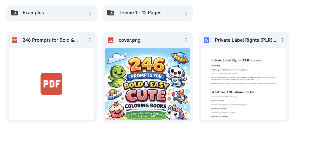 “246 Prompts for Bold & Easy Cute Coloring Books” does exactly what it promises. It gives you 246 ready-to-use prompts optimized for the specific style that works in the kids’ coloring book market. The prompts are thoughtfully organized, genuinely varied, and structured to work across multiple AI tools.