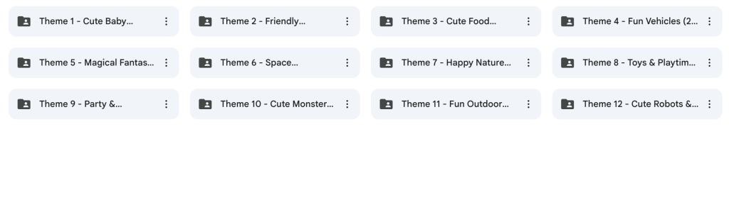 Each theme contains roughly 20 prompts. That means if you pick “Cute Food Characters”, you have 20 distinct ideas for smiling cupcakes, happy fruits, playful snacks, and more – enough to fill an entire book without repeating yourself.
