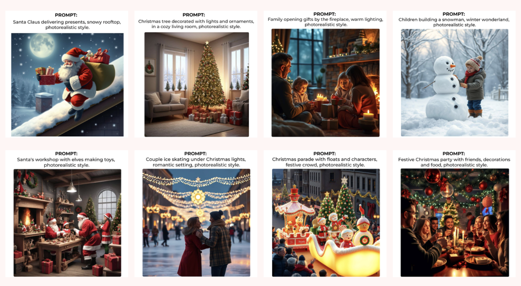 - My Use Case: I used these niche-specific prompts with Leonardo.ai to generate unique, cohesive art collections. In one weekend, I created three distinct sets: “Cosy Cottage Christmas,” “Modern Minimalist Holidays,” and “Vintage Santa Illustrations.”