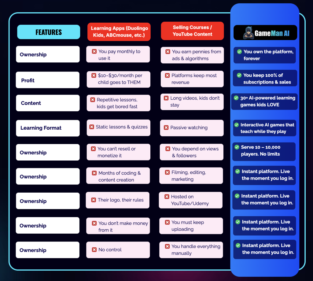 Forget the complex, months-long ordeal of game development. Gameman AI positions itself as the world’s first “business-in-a-box” platform that lets you launch your own branded, subscription-based educational gaming website in minutes. No coding. No design skills. No waiting for app store approvals.