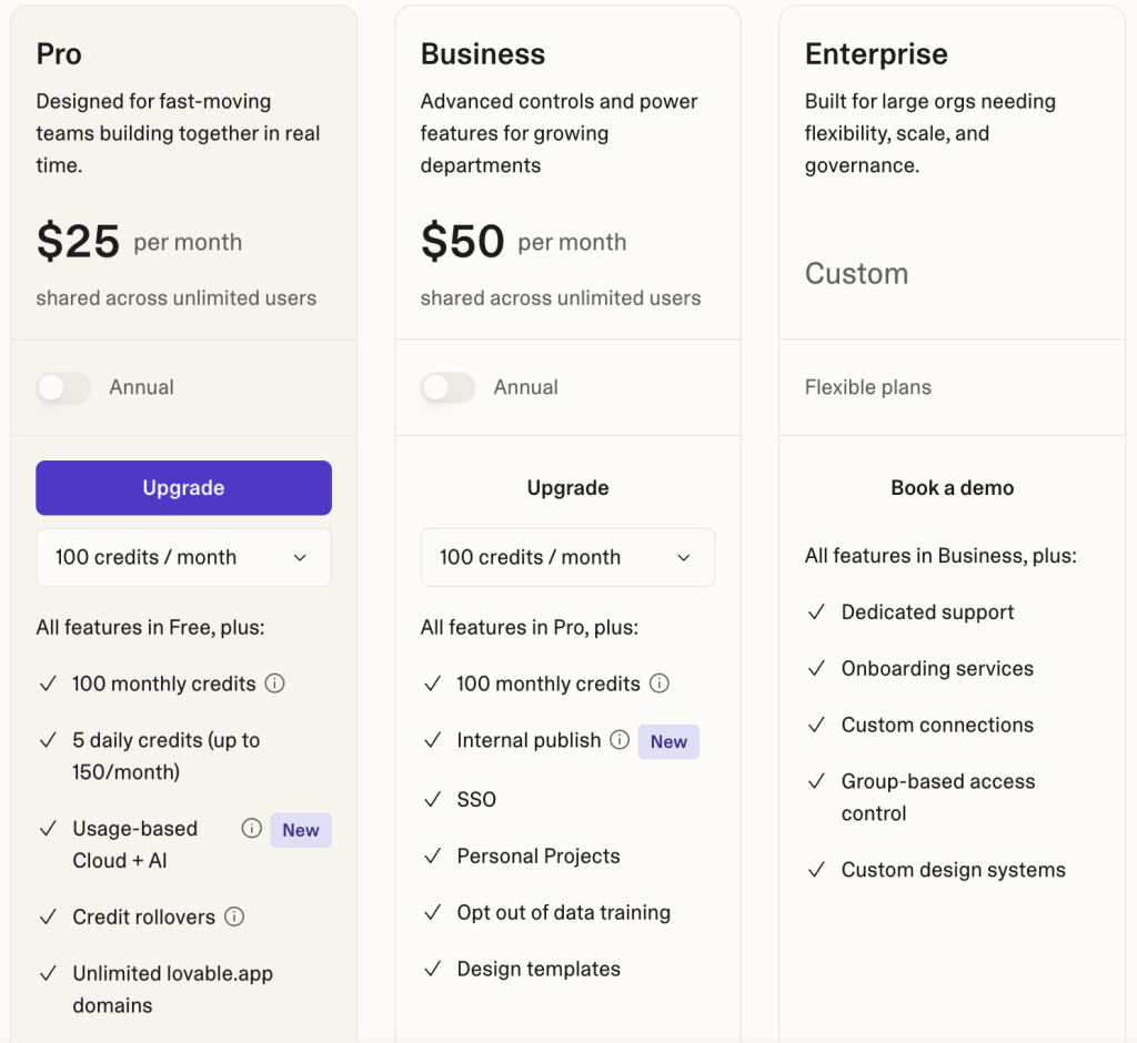 - Launch Plan ($50/month): This is the real entry point for serious builders. With 250 messages, it provides the breathing room needed for iterative development and debugging.