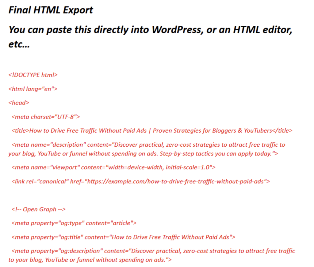 - Pre-Written Meta Data: Instantly usable meta titles and descriptions that are crafted for high click-through rates.