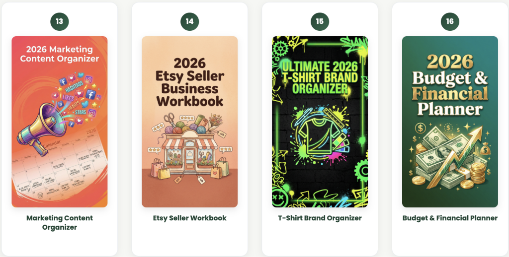 Small business planners, Etsy seller workbooks, marketing content organizers, budget trackers, money savings challenges. These are the kinds of practical tools people actually pay for.