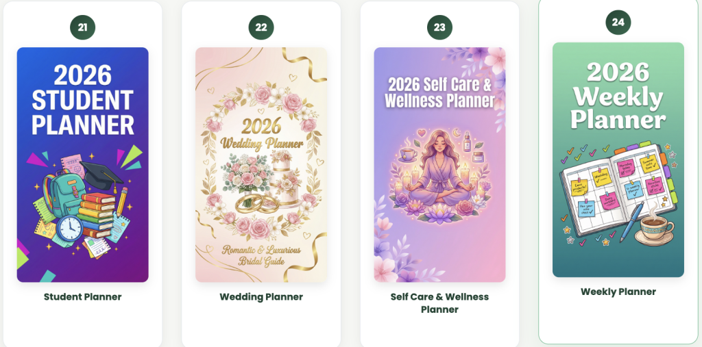 Wedding planners, vision boards, gratitude journals, fitness trackers, reading logs, cleaning planners, event organizers.
