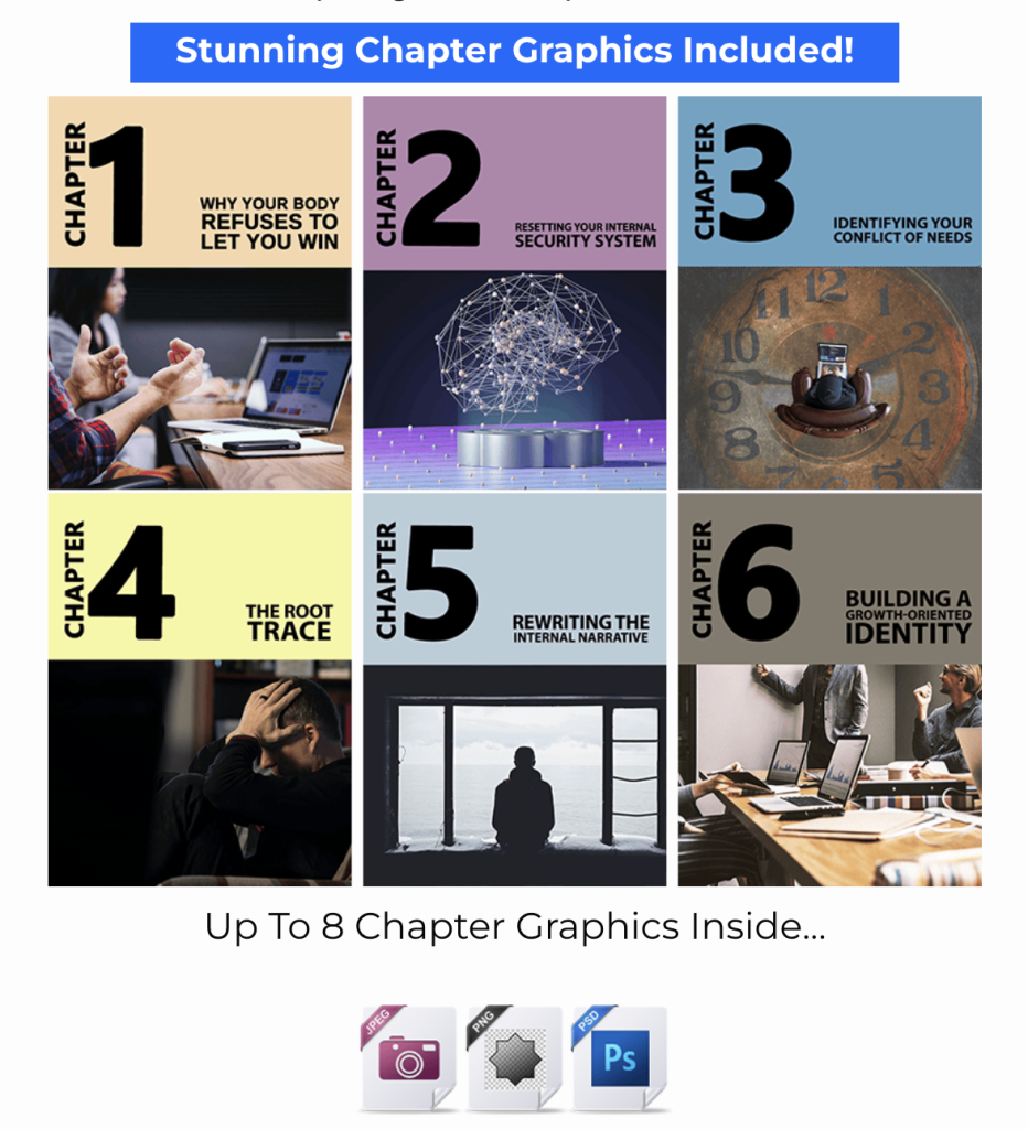 eCovers in multiple formats. Banner ads in standard sizes. PSD files for customization. Chapter graphics that match the ebook’s aesthetic.