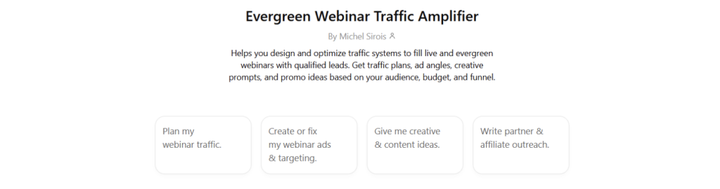 - The Traffic Amplifier (Bonus #1): This is your promotion department. Once your funnel is built, this GPT designs the campaign to fill it. It creates targeted ad hooks, social media angles, and a content calendar to drive registrations.