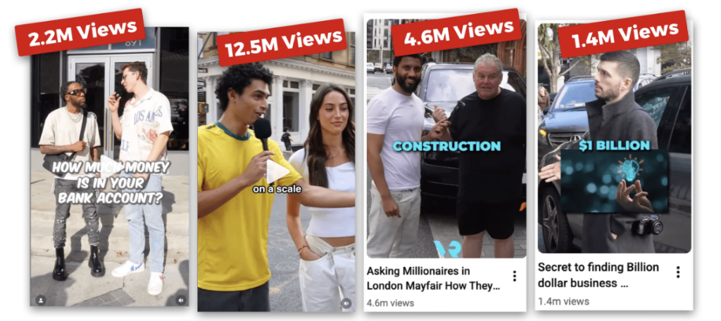 The turning point came when I stopped looking at what I was creating and started analyzing what was actually working in the wild. Across platforms, across niches, one format consistently cut through the noise: raw, unfiltered street interviews. You know the ones – “Asking millionaires in London how they made their first million” or “Stopping people on the busiest street in Europe for rapid-fire questions”.